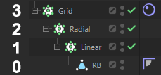 Les générateurs de clones tels que les objets Cloneur ou Répartition peuvent être dupliqués par imbrication (ce paramètre ne fonctionne que si la propriété se trouve sur un tel objet). Par exemple, si un objet Cloneur clone d'abord linéairement un cube, puis qu'un second cloneur duplique radialement l'ensemble du conglomérat de clones, puis le clone dans une grille, utilisez cette valeur pour définir les niveaux hiérarchiques, chacun d'entre eux devant fonctionner comme son propre corps rigide. Il sera compté à partir du bas : 0 fera de chaque clone un corps rigide, 1 seulement la première hiérarchie de clones (dans l'exemple du cloneur linéaire), etc. Dans l'exemple présenté, 3 considérerait alors l'ensemble du conglomérat de clones comme un seul corps rigide.