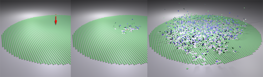 Cela permet de créer des réactions en chaîne intéressantes, par exemple. Ceci est similaire aux expériences bien connues de la souricière. Dans la scène suivante, chaque corps rigide a été doté d'une vitesse de départ dans la direction Y (vers le haut). Déclencher est réglé sur Collision.