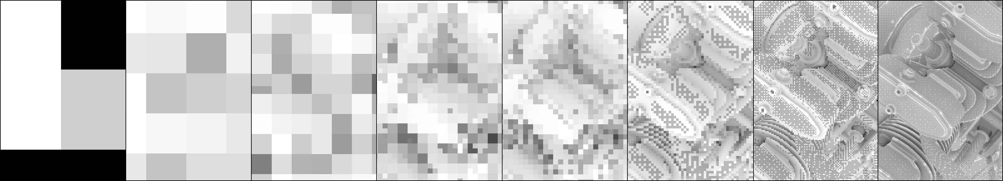 Une valeur de 0 entraînerai une haute définition de l’image (taille de pixel 1*1) et une valeur de -1 entraînera une taille de pixel de 2*2, -2 = 4*4 et ainsi de suite. La valeur du Taux minimum doit donc être inférieure ou égale à la valeur du Taux maximum.Des valeurs positives peuvent également être utilisées, ce qui permettra la mise en cache des zones de sous-pixel (cela peut, par exemple, être utile lorsqu’on utilise conjointement Déplacement des sous-polygones et que des détails se perdent).