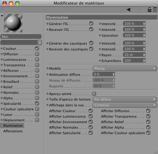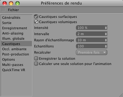 - Caustiques IG: Caustiques peu précises en mode RI (petit truc utile : assigner une propriété en activant Activer échantillonnage QMC forcé) mails elles réagissent à toutes les surfaces éclairées de la scène.