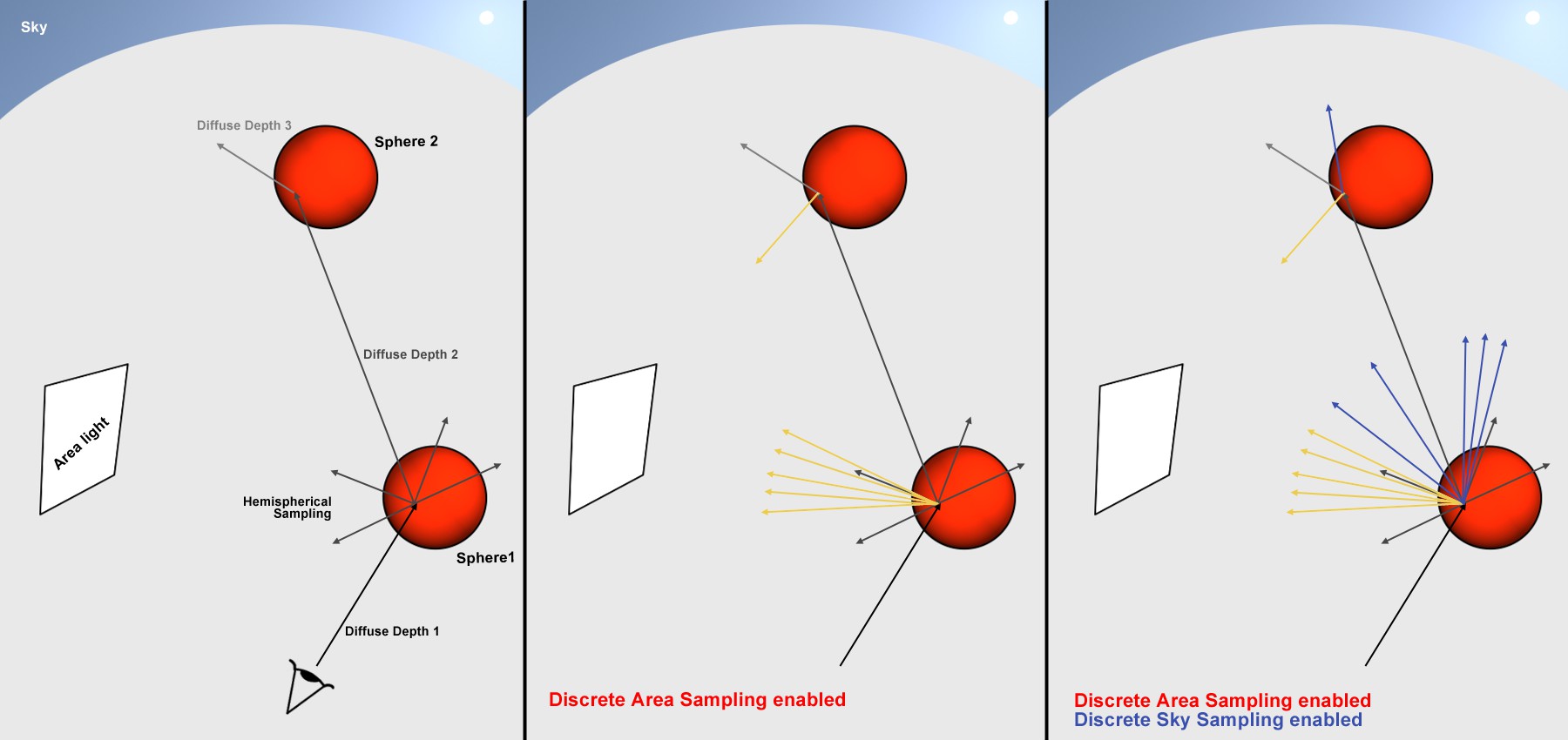 À gauche, il n’y a que l’effet de l’Échantillonnage Hémisphérique qui est visible. Au centre, il est activé, et à droite, désactivé (dans les deux derniers cas, l’Échantillonnage de zone distincte et l’Échantillonage de ciel distinct sont activés).Cette méthode d’échantillonnage est parfaitement adaptée pour être utilisée avec des lumières de zone étendues et homogènes (par exemple un ciel couvert et uniforme - qui ne nécessiterait pas les méthodes d’échantillonnage décrites ci-dessus).