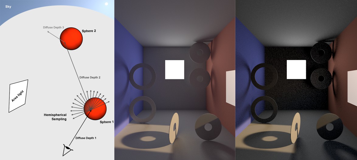 Sur l’image ci-dessus, vous pouvez voir que des échantillons supplémentaires sont créés par un échantillon qui vient d’en bas à gauche. Lorsque celui-ci touche un objet (les échantillons sont utilisés pour prélever la brillance et les couleurs d’un endroit spécifique de l’environnement = c’est la "récupération”). Comme vous pouvez le voir, le plus important se situe au point d’intersection - Profondeur de diffusion 1 - sur le premier objet (par conséquent, les lumières reflets - Profondeur de Diffusion 2, 3, etc. - s’estompent peu à peu dans le rendu).