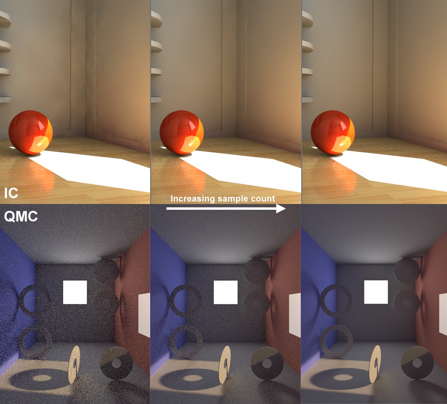 Assurez-vous de réduire le nombre d’Échantillons dans le cadre de la combinaison QMC+IR, car en interne, un bien plus grand nombre d’échantillons QMC sont utilisés pour l’IR, ce qui allonge les temps de rendu considérablement.