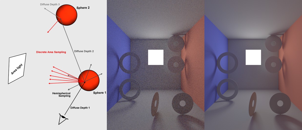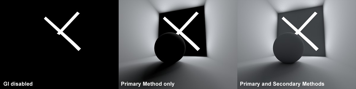 Pourquoi ces deux méthodes sont-elles séparées ? Simplement parce que la méthode primaire est la plus importante pour la qualité du rendu, et elle nécessite donc l’utilisation de méthodes de haute qualité comme le QMC et l’IR. Bien évidemment ces méthodes prennent plus de temps à être calculées. Pour les rebonds de lumière, des méthodes plus rapides peuvent être utilisées comme la Radiosité ou le Placage de lumière.