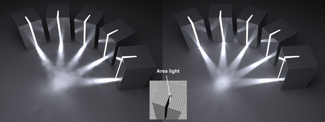 À noter: les lumières de zone ne seront pas écartées du calcul de l’IG si cette option est désactivée. Elles ne recevront aucune attention spécifique, et seront touchées de façon aléatoire par l’échantillonnage hémisphérique (en termes de grain, le résultat en sera modifié en conséquence).