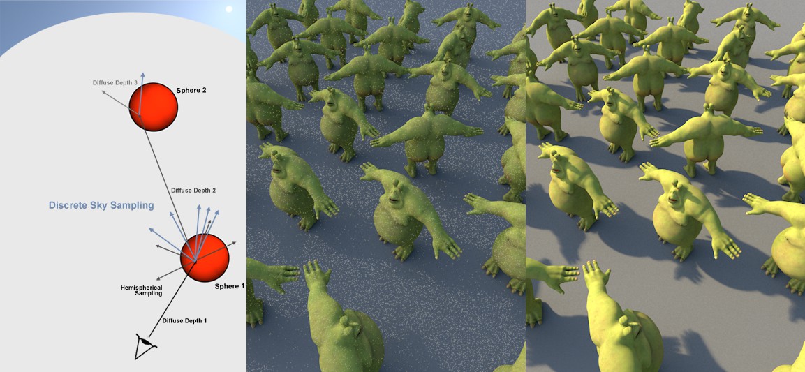 En plus de l’échantillonnage hémisphérique et de celui des lumières de zones, des échantillons supplémentaires sont envoyés en direction du ciel. Les points brillants sont ainsi supprimés, car chaque point visible par la caméra est analysé précisément en ce qui concerne l’influence du ciel (y compris son effet sur les autres éléments du projet).