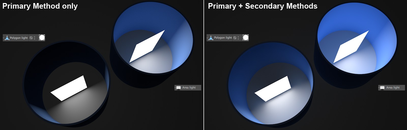 Dans cet exemple, seule la Méthode Primaire a été utilisée sur la partie gauche de l’image, et les Méthodes Primaires et Secondaires ont été utilisées sur la partie droite ; avec à gauche, une lumière polygonale. À droite, une lumière normale.