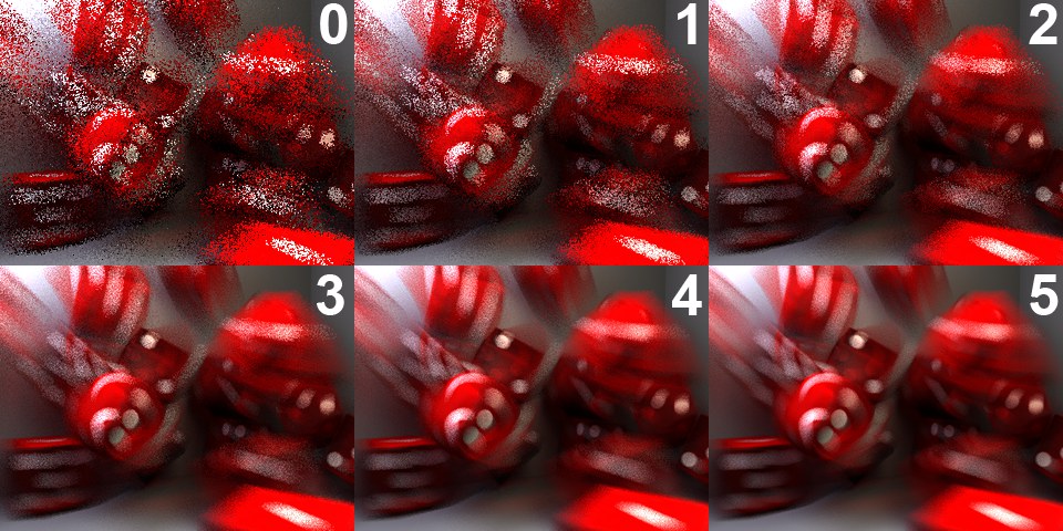 - Pour un nombre adaptatif: Un nombre d'échantillons extraits de la scène dans le but de rassembler les informations qui seront calculées par la suite (par les trois paramètres de rendu), ainsi si les valeurs entrées sont trop basses, des valeurs plus élevées pour les autres paramètres donneront de mauvais résultats: