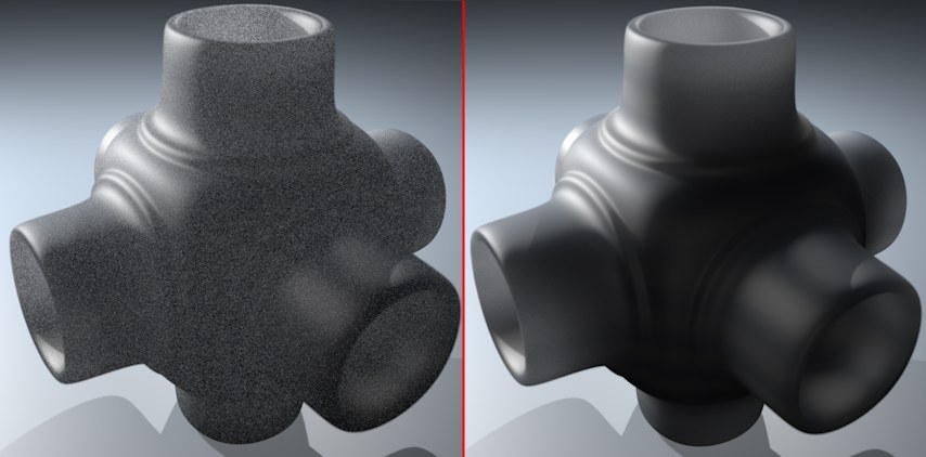 Si vous laissez charger le rendu d'une scène indéfiniment, vous pouvez atteindre une image parfaite, complètement homogène. Cependant, il est possible d'obtenir de très bons résultats bien avant l'infini. Il est tout de même possible que le temps de rendu soit aussi long qu'avec d'autres modes dans certaines circonstances.