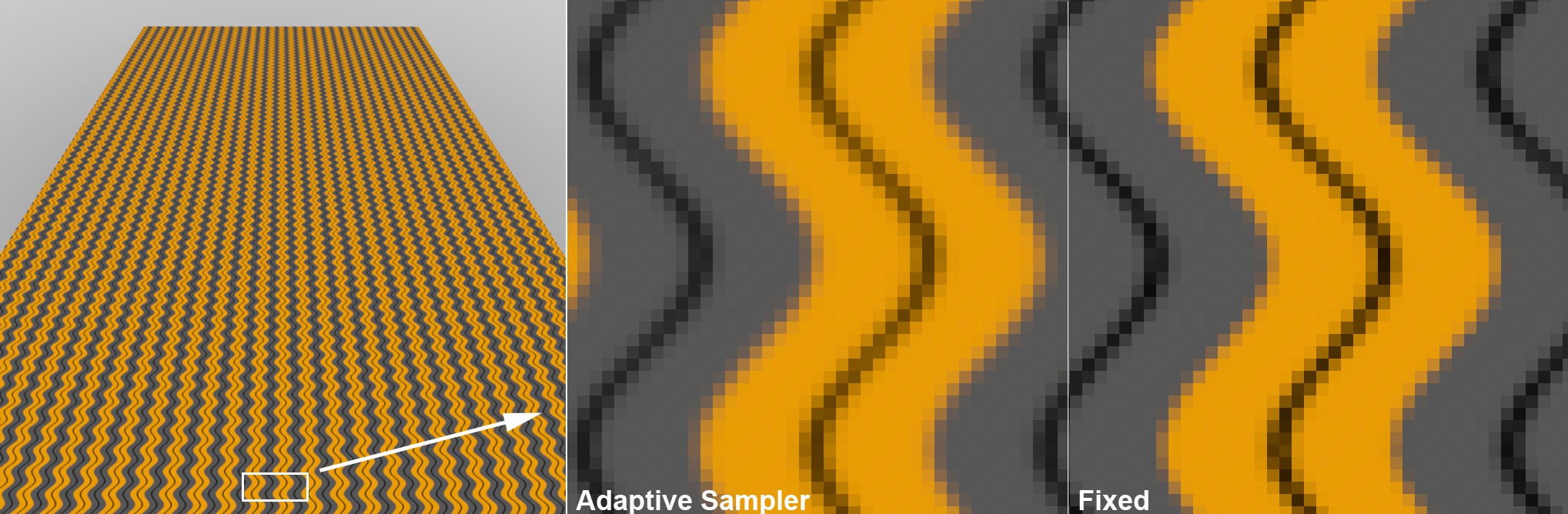 Notez tout de même que l’échantillonneur Adaptatif produit des résultats de rendu légèrement moins précis que ceux du mode Fixe :