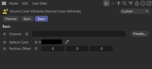 The Sample Channel loads a color VDB grid to drive the Volume Scalar Attribute. A VDB grid is loaded by typing its name into the channel field, for example, typing "color" directly into the field to load a volume's color channel. If a non-color grid is loaded, like a scalar grid used for density or temperature, it will appear in grayscale.