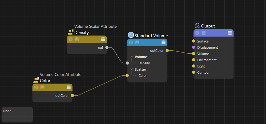 The Volume Color Attribute is a shading node that allows for programmable volume shading when used with a Standard Volume shader. For example, a color VDB grid can be loaded and it can be displaced with a noise shader. This can be used for many creative effects and adding color detail to low resolution volumes.