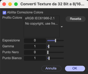 Quando convertite le texture a 32 bit, si apre una finestra contenente i seguenti parametri di conversione: