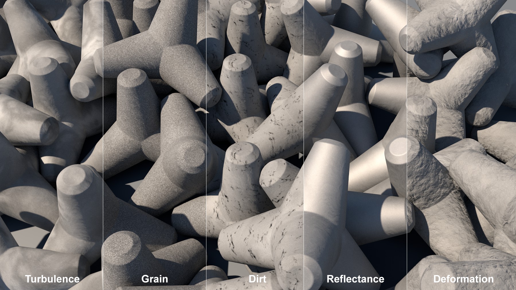 Il settaggio Turbolenza può essere usato per aggiungere striscie chiare su grandi aree di calcestruzzo. Valori piccoli disabiliteranno l'effetto mentre valori più alti lo accentueranno di conseguenza (questo vale anche per le due impostazioni successive).