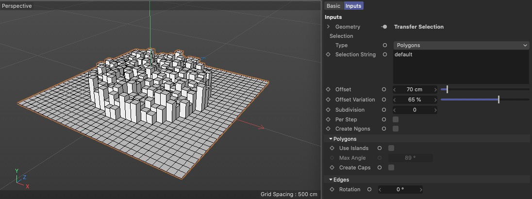 Questo Nodo può essere utilizzato per estrudere punti, bordi o poligoni. Questa funzione riflette in gran parte il comando di modellazione che porta lo stesso nome nel menu Mesh.