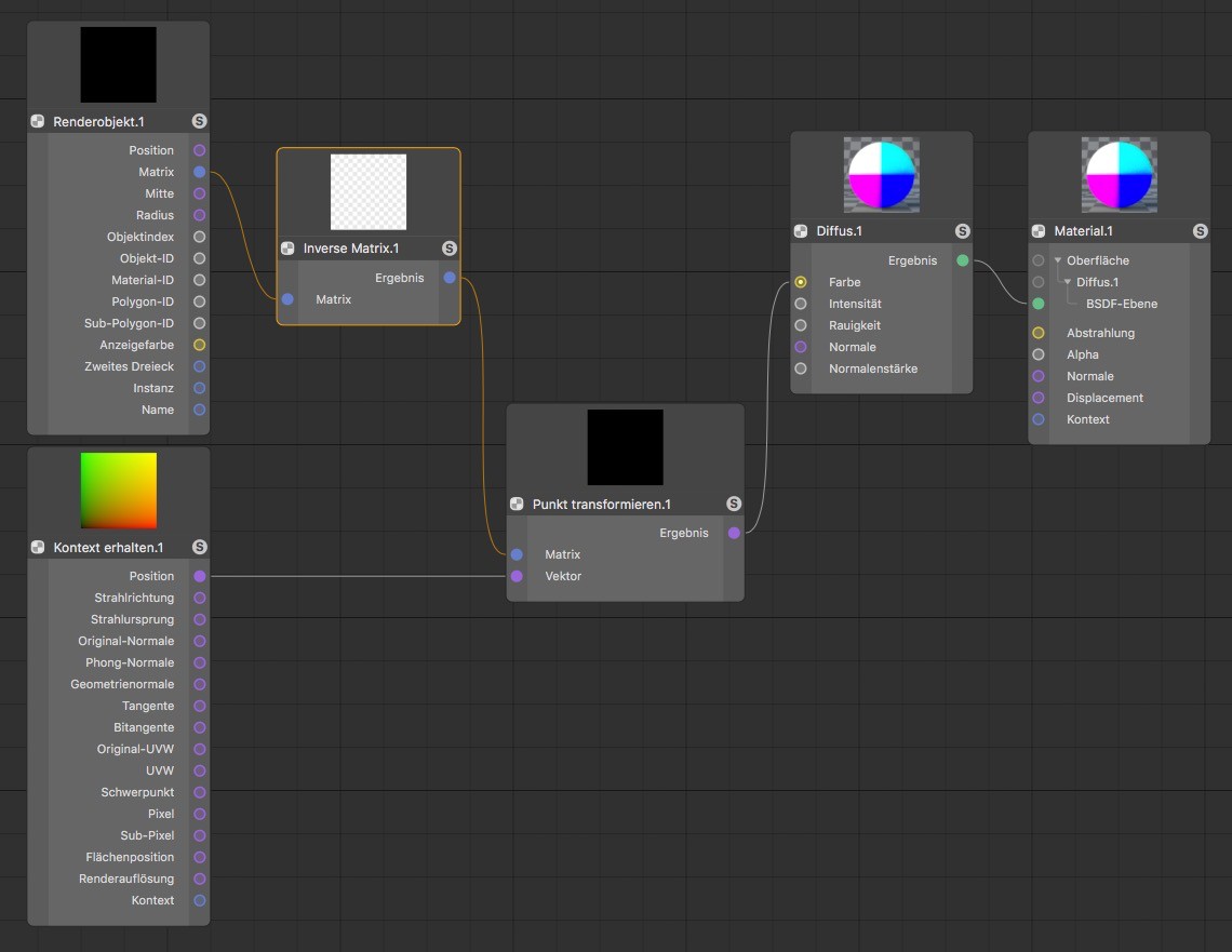 Se desiderate eseguire il calcolo al contrario, ovvero convertire una posizione globale in una posizione locale all'interno di un dato oggetto, la matrice dell'oggetto deve essere invertita prima della moltiplicazione con la posizione globale del punto. Questa è l’esatta funzione di questo Nodo.