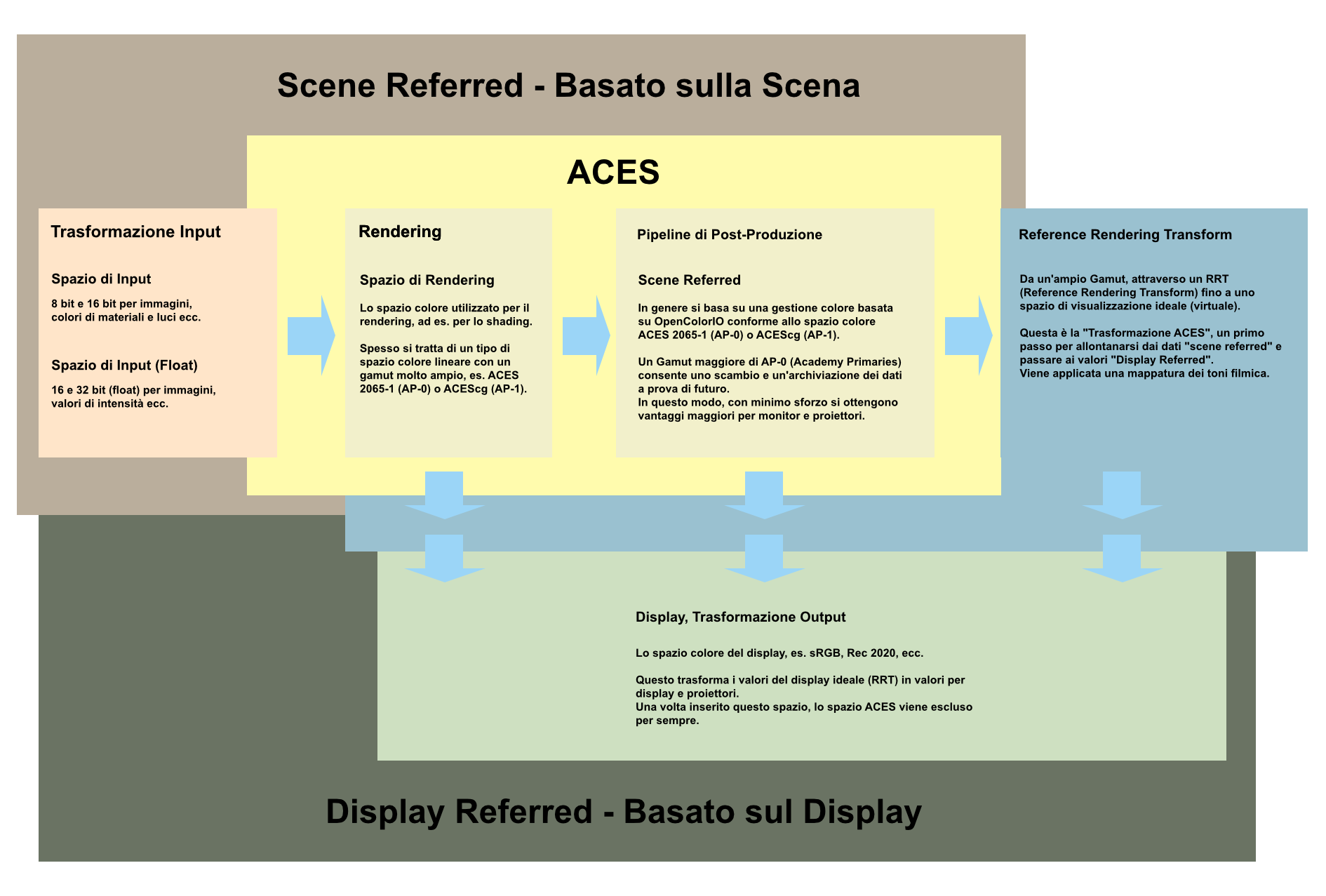 Il flusso di lavoro Scene Referred, che fa parte della filosofia ACES, modifica solo ciò che fa parte dell'output finale e limita tutte le modifiche che non sono legate all'obiettivo. Nel caso di una pipeline lunga, questo evita di dover passare attraverso molte fasi diverse relative alla visualizzazione. Ogni modifica apportata allo spazio colore, anche se basata su valori virgola mobile e normalmente senza perdite, modificherà il comportamento degli strumenti utilizzati nella pipeline, anche per un comando semplice come la sfocatura.