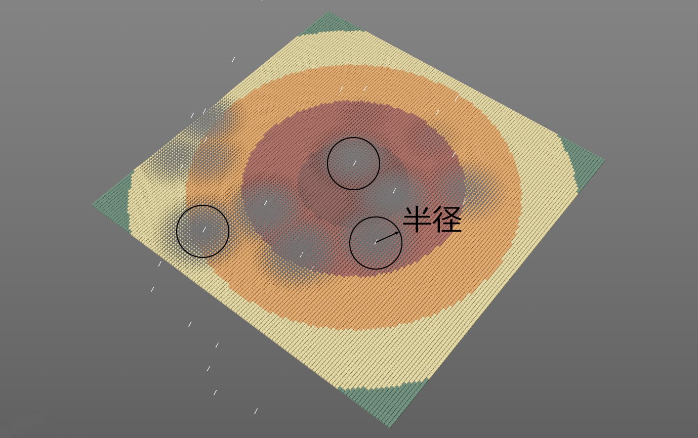 パーティクルフィールドレイヤーは、調整できる半径内で各パーティクルに影響します。