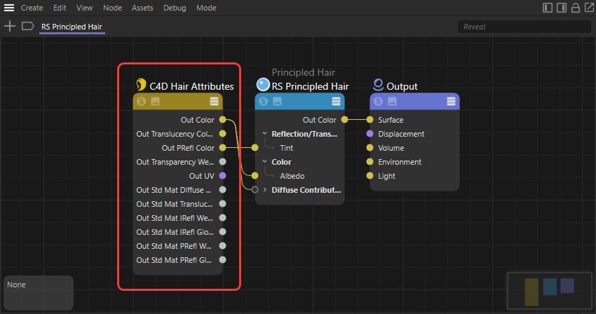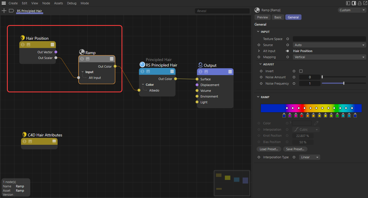 | C4D Hair Attributes driving the colors of a Principled Hair material |
