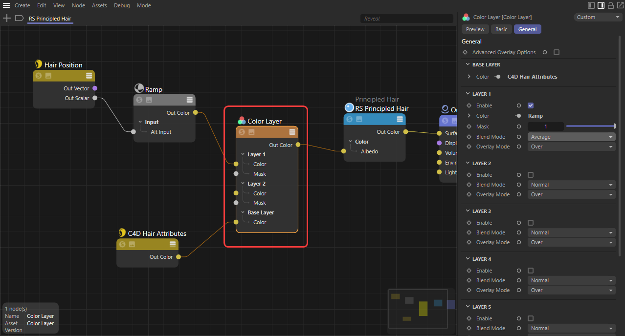 Hair color can be mixed and tweaked using shading nodes like the color correct and color layer. However, you may prefer to accomplish all the color mixing in the C4D hair material and just pass the result to the Principled Hair with the C4D Hair Attributes node.