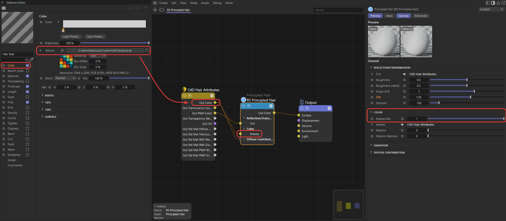 The C4D Hair Attributes node can be disconnected if you intend to use the Principled Hair controls exclusively, however the C4D hair material will still be used to drive all non-color attributes like frizz and curl.