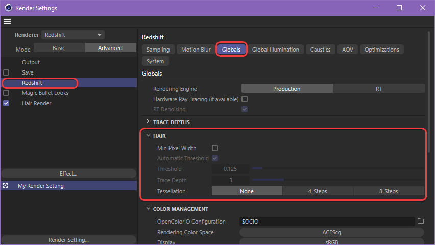 Instead, use the "Hair" parameters in Redshift's "Globals" render settings tab as pictured below. For more information please see the the Globals Advanded page.