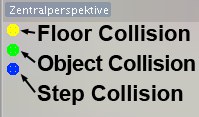 Different icons represent different types of collisions.These icons will be displayed in the 3D view when collisions or certain conditions are recognized by the Virtual Walkthrough tool. When climbing steps (Walk-through mode with Tank-controls), make sure that the yellow icon is displayed. If not you can adjust your position using the F and R keys.