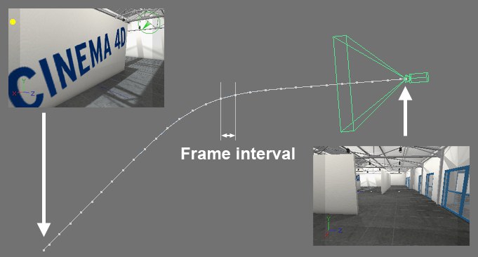 A camera animation using camera keys.Contrary to the functionalities described above, the camera’s position and angle of view animations are made using the settings described below via a camera parameter animation and not via splines. This bears the advantage that camera zooms created using the animated camera focal width parameter will be taken into account.