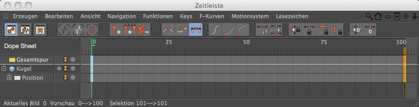 Nehmen Sie an, Sie haben eine Kugel animiert, die sich auf der X-Achse von X=0 (Bild =0) bis X=300 (Bild 100) bewegt.