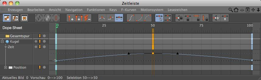 Wie wird sich die Kugel jetzt bewegen? Ganz einfach: bei Bild 50 hat die Zeit-Spur ihr Maximum von 100%; also hat auch dort der zugeordnete Parameter Position.X der Kugel seinen maximalen Wert: X=300. Danach läuft die Zeit-Spur wieder auf 0% zurück. Das bedeutet für den Parameter Position.X ebenfalls wieder ein Wert von 0. Die Kugel bewegt sich also wieder zurück! Hin und zurück. Und das, obwohl die Kugel selbst nur zwei Keys hat. Wie zwischen diesen beiden Keys verfahren wird, bestimmt die Zeit-Kurve.