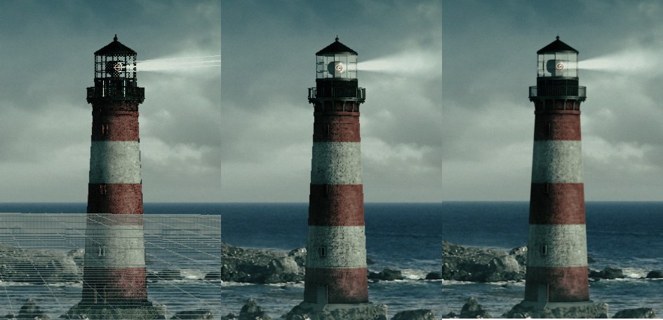 Diese werden anschließend im Compositing zusammengesetzt, was unter anderem die Möglichkeit mit sich bringt, Farbkorrekturen vorzunehmen. Ein typisches Szenario wäre hier im Rendering die unterschiedlichen Oberflächen-Reflexionen (Diffuse, Specular, Shadow, ... ) separat auszugeben und anschließend in After Effects mit entsprechenden Ebenen-Modi zusammen zu setzten.