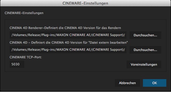 Hier wird der Kommunikationsport zwischen CINEWARE und dem integrierten Cinema 4D Renderer (CINERENDER) festgelegt. Sollte diese Einstellung geändert werden müssen, benötigt After Effects einen Neustart.