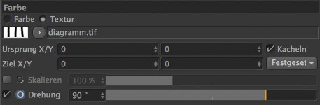 Mit aktivierter Drehung können Sie das aufgenommene Muster innerhalb der Grenzen –180° und 180° drehen. Haben Sie beispielsweise eine Textur importiert oder haben diese mit der Pipette aufgenommen, kann es passieren, dass diese um 90° verdreht ist. Hiermit können Sie diese dann ganz einfach in die passende Richtung drehen.