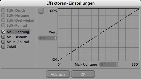 Ein Effektor macht den jeweiligen Parameter (für Skalieren oder Drehung) dynamisch abhängig von Eingabegrößen wie Anpreßdruck Ihres Zeichentablett-Stiftes und/oder anderen. Darüber hinaus können Sie die raffiniertesten Kurven erstellen, die dann die Parameter-Erzeugung beeinflussen. Details hierzu entnehmen Sie bitte dem Abschnitt Effektoren.