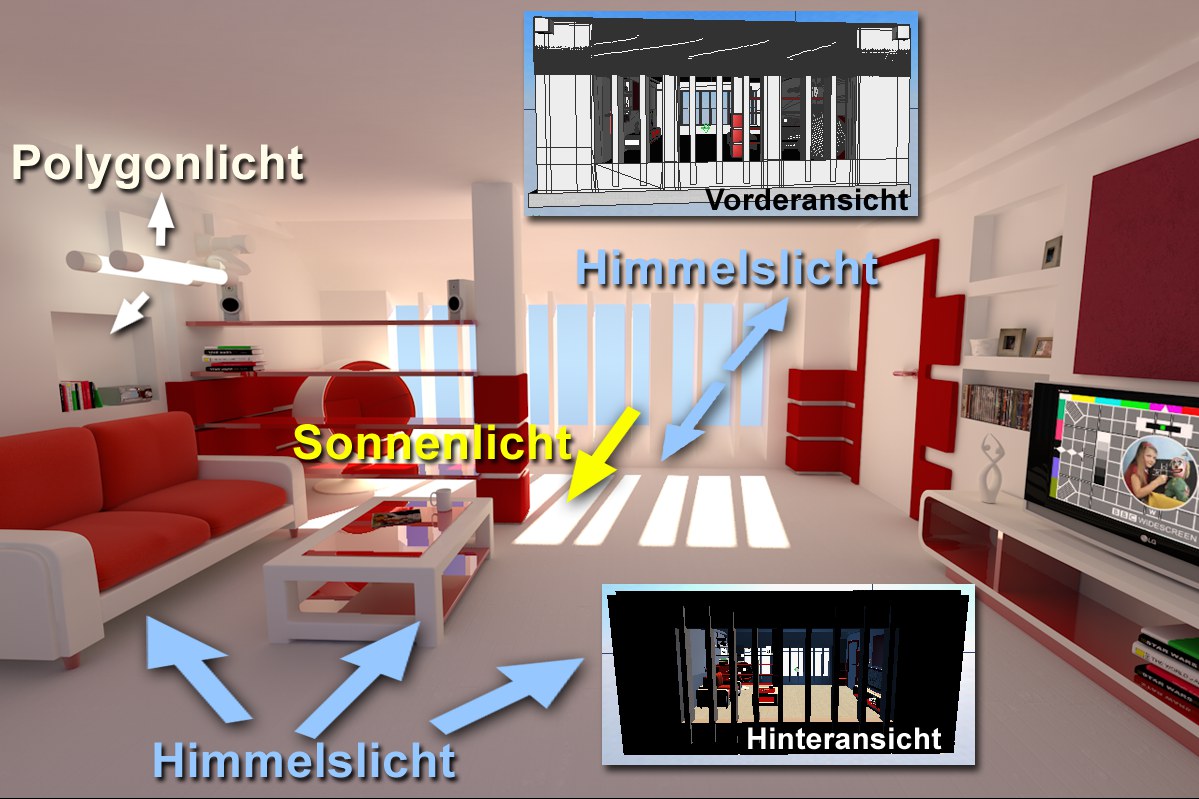 Ansonsten befinden sich 2 Polygonlichter (Objekte mit einem leuchtenden Material) in der Szene, die allerdings nicht allzu viel Einfluss auf die Beleuchtung nehmen. Der ebenfalls etwas Licht abstrahlende Fernseher kann aber guten Gewissens vernachlässigt werden.