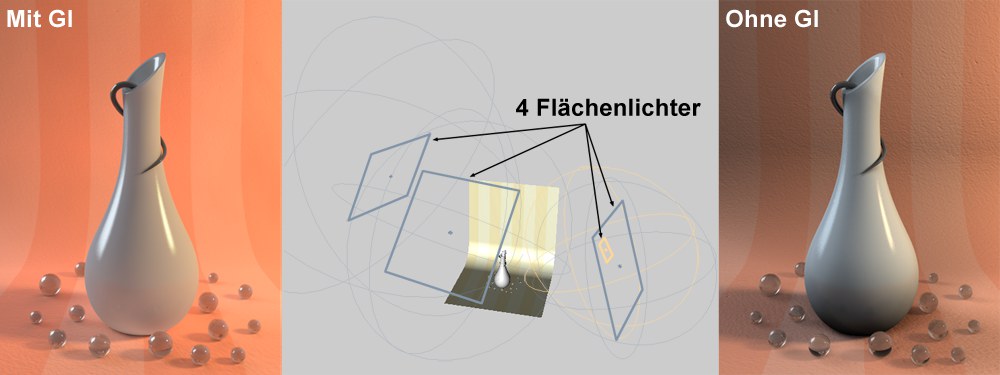 Das bedeutet für die GI-Berechnung: Sie regeln Glanzlichter über den Reflektivitätsskanal und Größe/Farbe des leuchtenden Objekts.