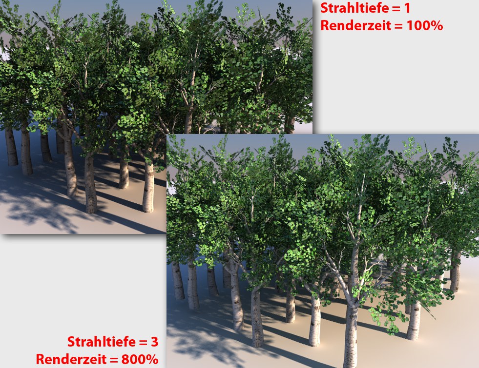Links mit Strahltiefe1, rechts mit 3 gerendert. Die visuellen Unterschiede sind klein, die Renderzeiten dagegen