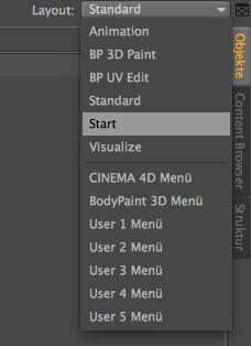 Unten werden die verschiedene Startdateien von Cinema 4D erklärt. An dieser Stelle nun soll der Umgang mit verschiedenen Bildschirm-Layouts, den Oberflächen für die tägliche Arbeit, behandelt werden.