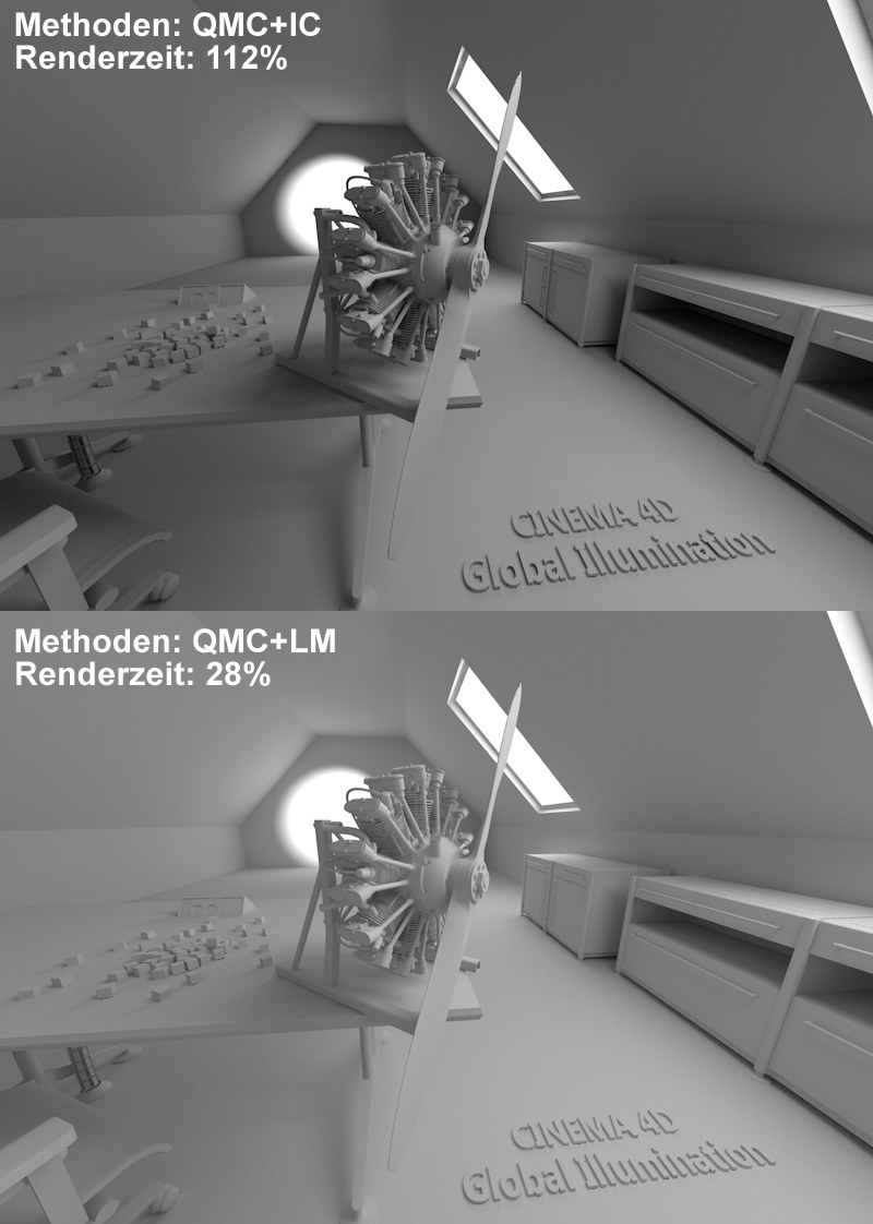 Beachten Sie, dass die Renderzeiten hier nur Trends vorgeben und bei anderen Projekten anders aussehen können (auch sinkt die Renderzeit bei IC+LM und QMC+LM noch einmal beträchtlich, wenn die Option Radiosity-Maps erstellen aktiviert wird). 100% Renderzeit wird für QMC+QMC als präziseste Methode definiert.
