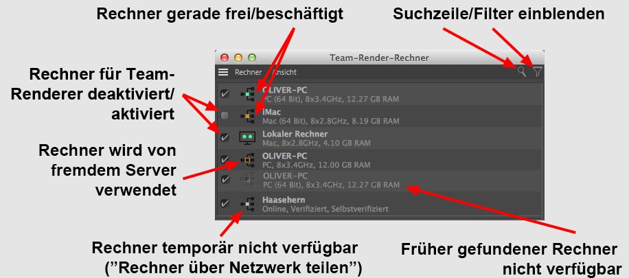 In der rechten Spalte sind alle Rechner mit Namen und einigen technischen Details aufgelistet, die aktuell oder früher schon einmal gefunden worden sind (s. Team Render Fehlerbehebung).