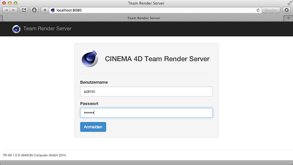 Es öffnet sich die Startseite des Team Render Servers, bei dem Sie sich jetzt voreinstellungsgemäß mit dem