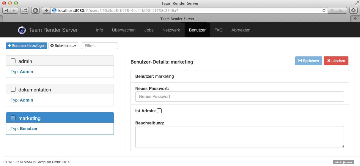 zu vergeben. Danach kann der neu angelegte Benutzer sich mit Namen und Passwort am Team Render Server anmelden (Browser-Adresse siehe Webinterface öffnen) und Render-Jobs beauftragen.