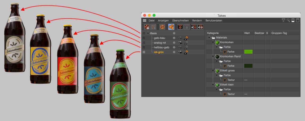 Hier muss also 5 Mal gerendert werden und dabei jeweils die Flaschenetikett-Texturen und Kronkorkenfarben ausgetauscht werden. Mit dem Take-System ist das schnell eingestellt und ein Aufruf des Befehls Alle Takes im Bild-Manager rendern rendert dann alles in einem Rutsch.