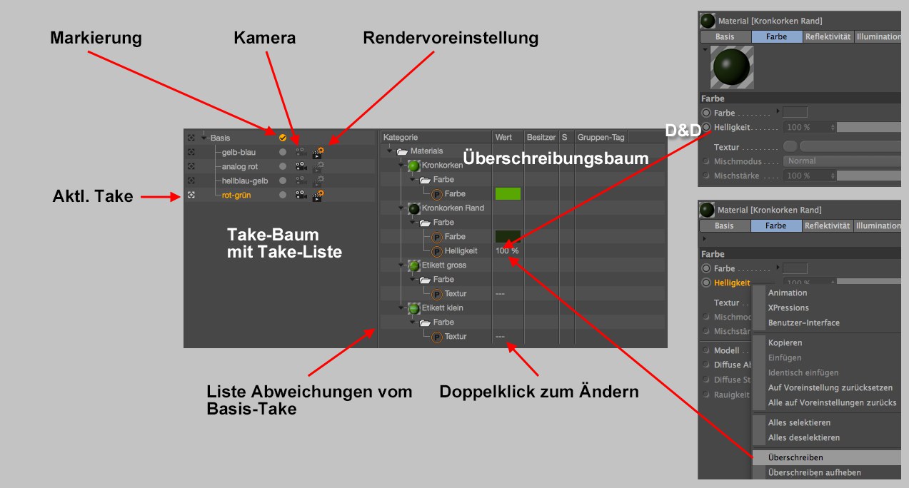 Das Take-System stellt Ihnen mehrere Zustände – z.B. variierende (auch animierte!) Objekt/Tag/Material-Parameter, verschiedene Rendervoreinstellungen und Kameras – eines Projekts in einer einzigen Datei zur Verfügung. Diese verschiedenen Zustände, Takes genannt, können mit einem Mausklick ausgewählt werden, was praktisch jeweils eine Vielzahl von Parameteränderungen am Projekt nach sich ziehen kann. Um bei dem im vorherigen Abschnitt gewählten Beispiel zu bleiben, ist es z.B. möglich:
