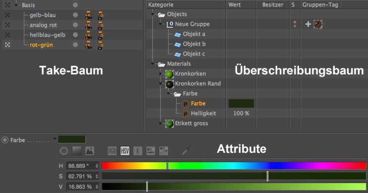 Danach kann der Parameterwert im Attribute-Manager oder per Doppelklick auf den entsprechenden Parameter in der "Wert"-Spalte des Take-Managers geändert werden. Ein solcherart überschriebener Parameter vererbt sich dann wiederum auf untergeordnete Takes, die diesen wiederum überschreiben könnten. Das Vererben von Eigenschaften verhält sich also wie das der Tags im Objekt-Manager: Wenn in einer Hierarchie das oberste Objekt ein Material-Tag trägt, vererbt sich das auf alle untergeordneten Objekte, es sei denn eines von diesen trägt ein eigenes Material-Tag.