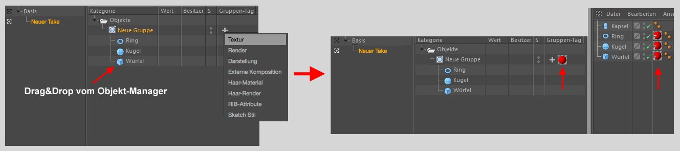 Wenn es die Aufgabenstellung erfordert, eine bestimmte Anzahl an Objekten für einen Take zu gruppieren und diesen eine gemeinsame Behandlung durch einige ausgesuchte Tags zukommen zu lassen, sind Sie bei diesem Befehl richtig. So kann es ja ganz praktisch sein, einer Objektgruppe einen gemeinsamen Alphakanal (über den Objekt-Kanal eines Render-Tags) und in einem anderen Take einer anders zusammen gesetzten Objektgruppe einen gemeinsamen Alphakanal zu spendieren. Oder einfacher: unterschiedlichen Objektgruppen pro Take ein anderes Material zuweisen. Der Möglichkeiten gibt es viele. Allerdings beschränken sich die Überschreibungs-Tags auf renderspezifische Typen und es kann jeweils nur einer dieser Typen pro Überschreibungsgsgruppe verwendet werden.
