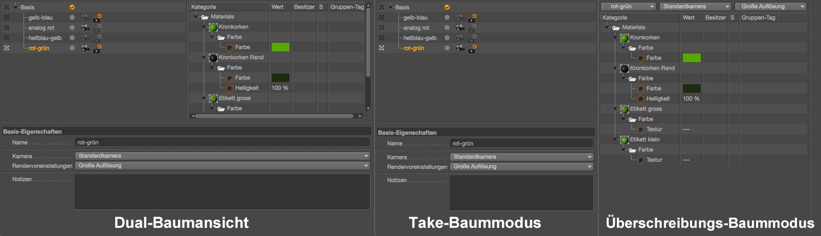 Der Basis-Take beinhaltet also sämtliche Elemente wie Objekte, Tags, Materialien, Animationen, deren Beziehungen zueinander (Zuordnungen, Hierarchien etc.), also alles, was Ihr Projekt ausmacht. Sie repräsentiert die komplette Cinema 4D-Projektdatei wie von früheren Versionen gewohnt. Bei Aktivierung des Basis-Takes werden alle in den übrigen Takes vorgenommenen Überschreibungen im Überschreibungsbaum aufgelistet.