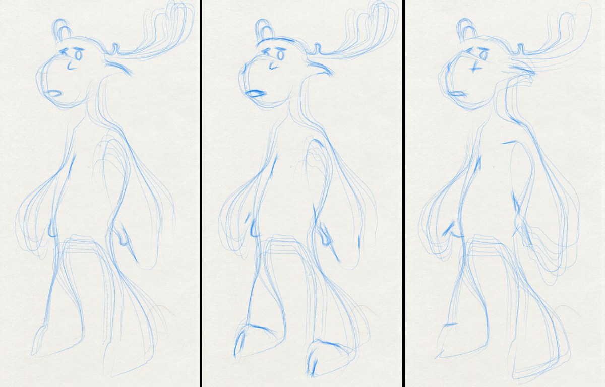 Der linke Elch in beiden Abbildungen wurde nur mit dem Linientyp Falten gerendert. Dies ist der meist gebrauchte Linientyp für schnelle Skizzen. Er führt zu guten Ergebnissen, allerdings ist er für schnelle Skizzen etwas zu akkurat in der Platzierung der Linien. Ein echter Künstler würde hier und da noch einige Extra-Striche anbringen, um Volumen und Struktur herauszuheben.