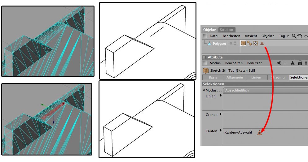 Selektieren Sie auf dem Polygon-Objekt die Kanten, die gerendert werden sollen. Frieren Sie die Selektion ein (Selektieren / Selektion einfrieren). Verleihen Sie dem Objekt jetzt ein Sketch Stil Tag (falls es noch keines haben sollte). Aktivieren Sie im Tag die Option Kanten (Tab Linien). Im Tab Selektionen ziehen Sie das Selektions-Tag in das Feld Kanten.