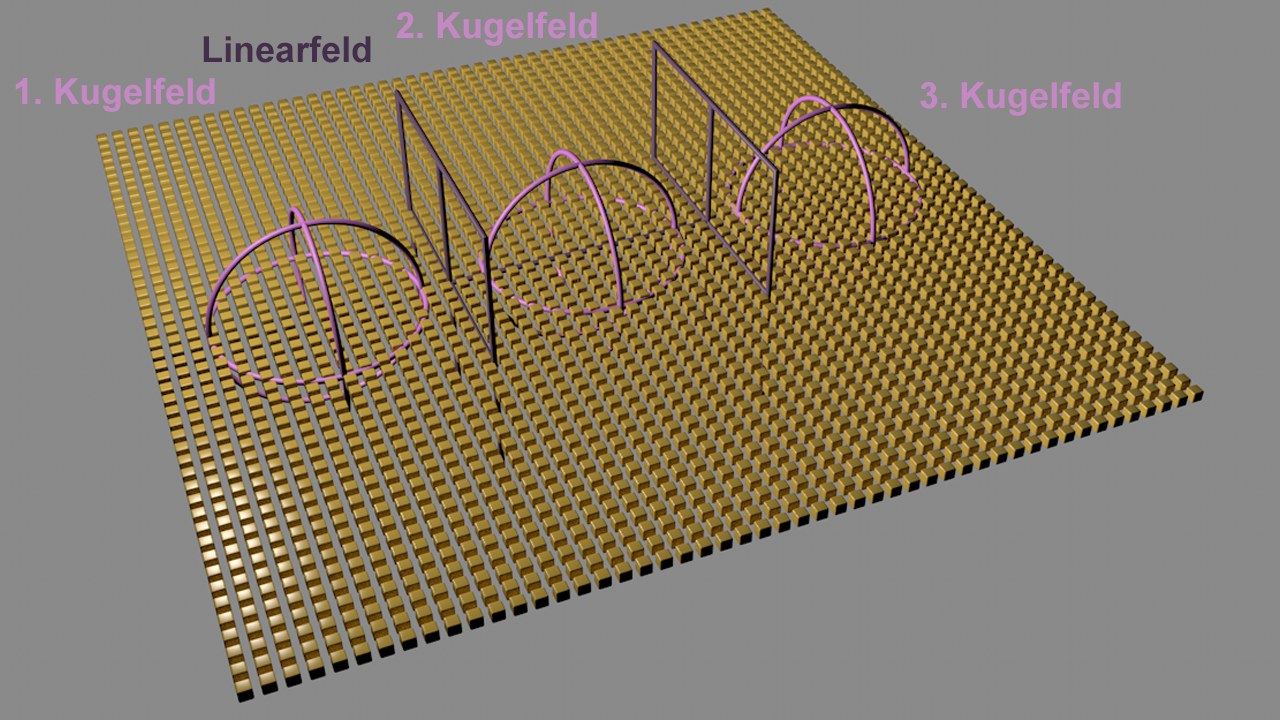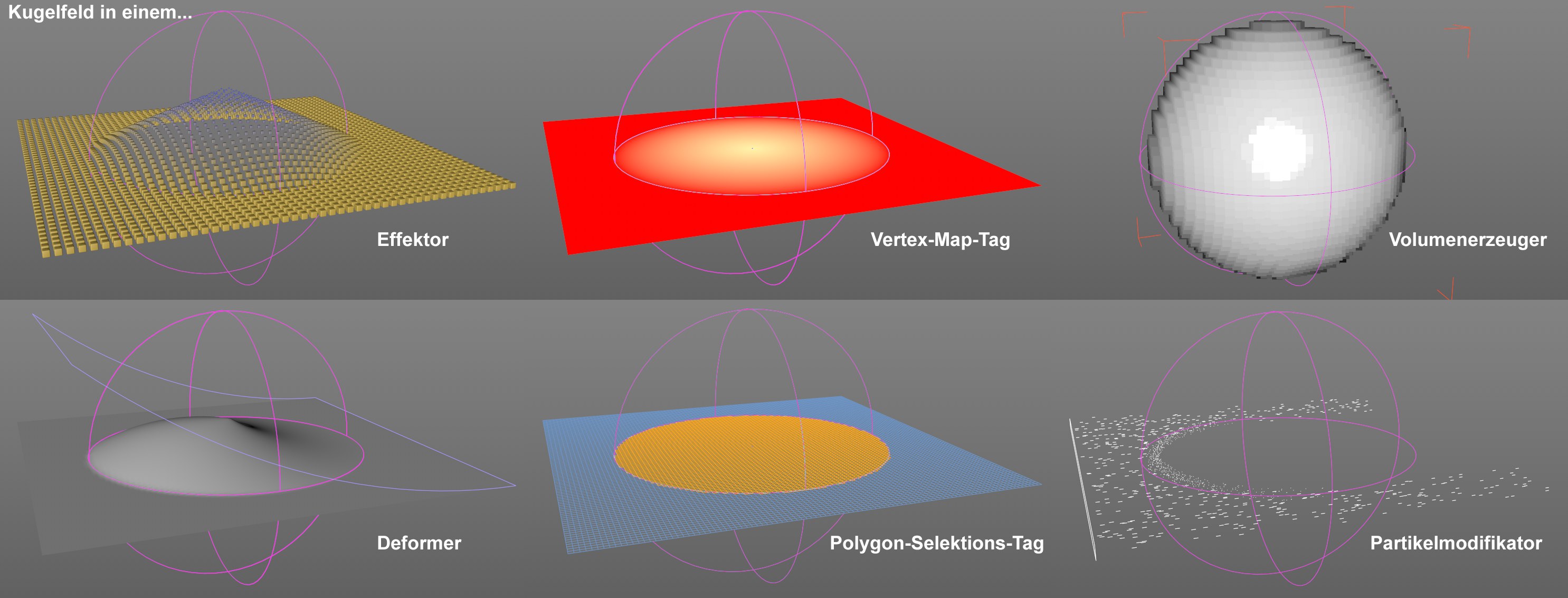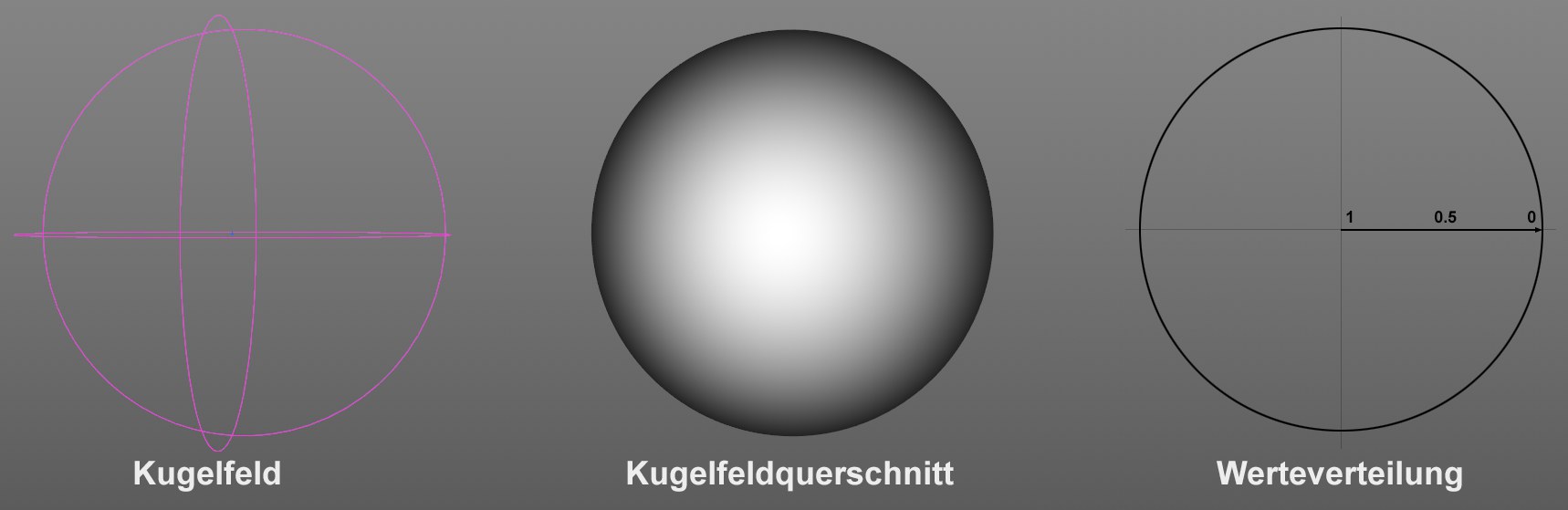 Stellen Sie sich Felder als räumliche Stärkewertverteilung vor, die einen Effekt steuern. In etwa so wie einen dreidimensionalen Noise, der mit seinem Graustufenverlauf die Stärke eines Effekts definiert. Wo der Noise weiß ist, wirkt der Effekt maximal, wo er schwarz ist, minimal und Graustufen entsprechend. Das einfachste Feld ist ein Kugelfeld:
